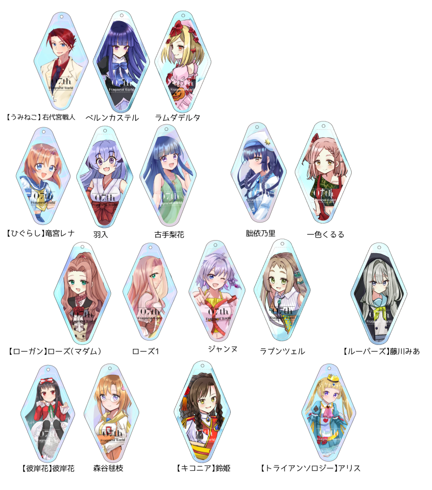 【ローズガンズデイズ】 ローズ(マダム)/ジャンヌ/ラプンツェル 【ルーパーズ】 藤川みあ 【彼岸花の咲く夜に】 彼岸花/森谷毬枝 【キコニアのなく頃に】 鈴姫 【トライアンソロジー】 アリス